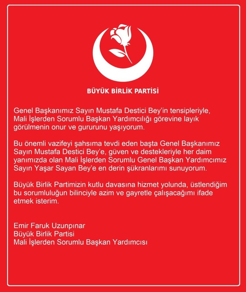 “Genel Başkanımız Sayın Mustafa Destici Bey’in tensipleriyle, Mali İşlerden Sorumlu Genel Başkan Yardımcılığı gibi önemli ve sorumluluğu yüksek bir göreve layık görülmüş bulunuyorum. Bu görevi şahsıma tevdi eden başta Genel Başkanımız Sayın Mustafa Destici’ye, ayrıca güven ve destekleriyle her daim yanımızda olan Mali İşlerden Sorumlu Genel Başkan Yardımcımız Sayın Yaşar Sayan’a şükranlarımı sunuyorum. Büyük Birlik Partisi’nin kutlu davasına hizmet yolunda, sorumluluk bilinciyle, azim ve gayretle çalışmaya devam edeceğim.”